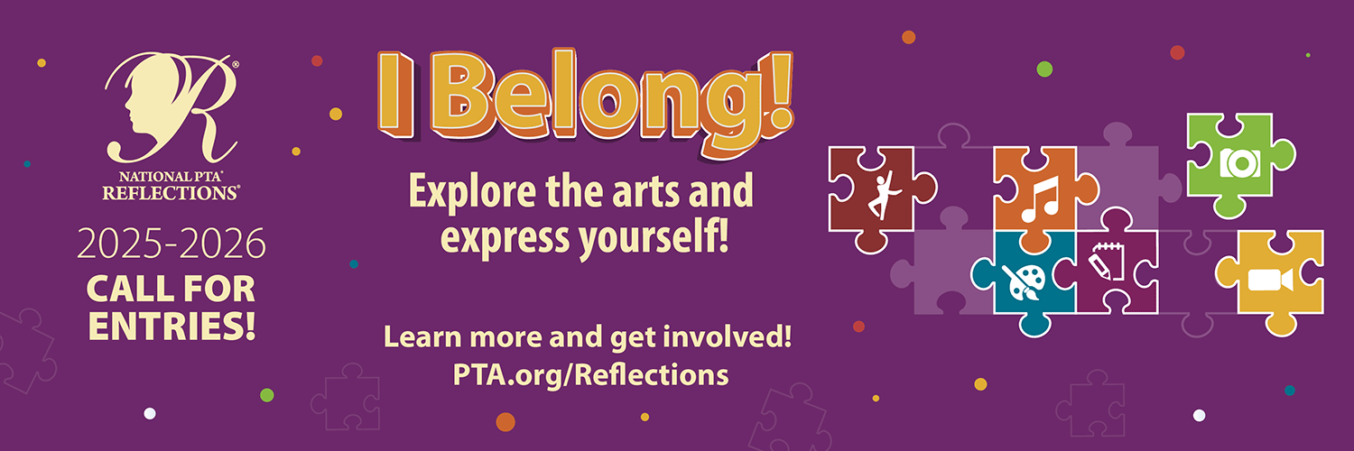 MCCPTA is officially kicking off the PTA Reflections Arts Program! Reflections is a low-cost/budget-neutral PTA program that supports student talent in the arts. Whether the student artist is interested in dance choreography, film production, music composition, visual arts, photography, or literature -- there's a place to showcase one's creative side. Students receive recognition through opportunities to display their artwork or production and a chance to receive scholarships. Each year, National PTA chooses a new theme which is intended to inspire students to express their creativity while embracing their unique perspectives. The 2025–2026 Reflections theme is "I Belong!". Bring the National PTA Reflections Arts Program to your school/PTA in the 2025-2026 school year!